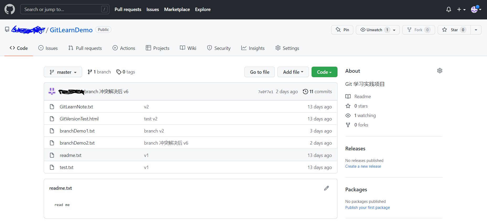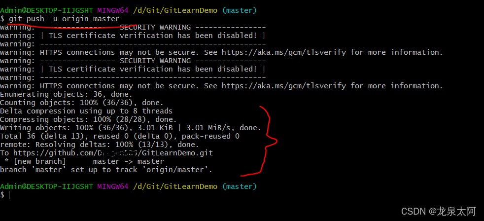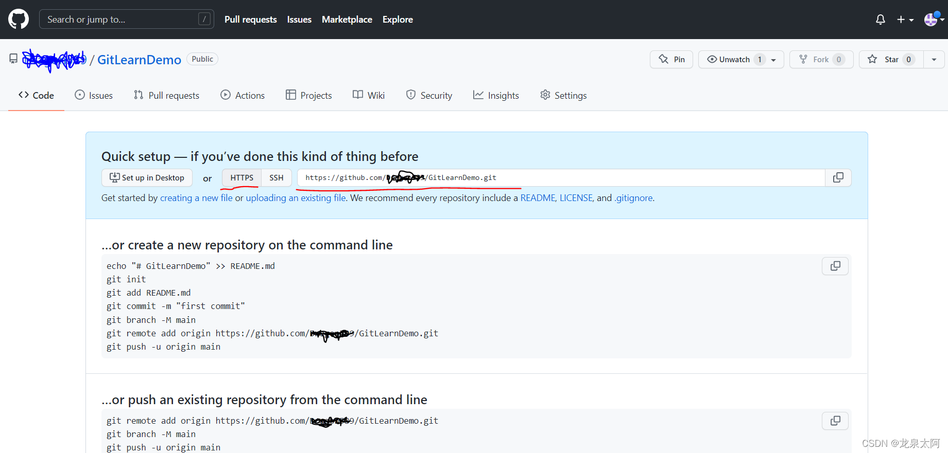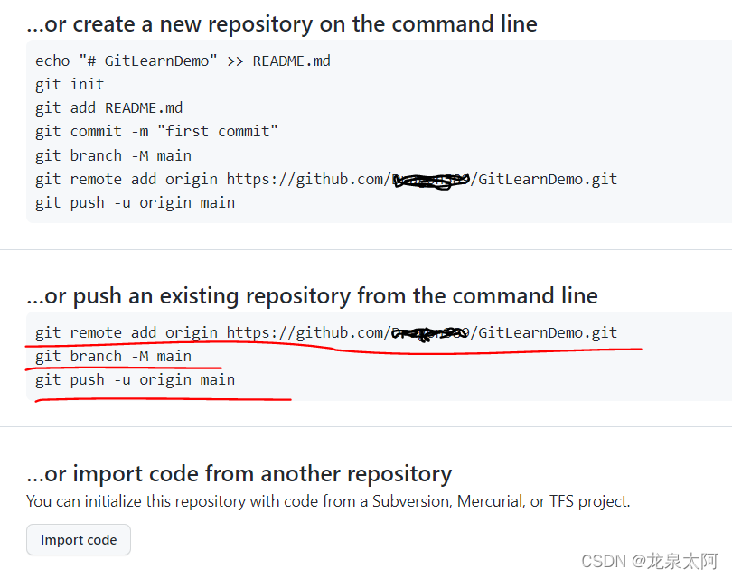 这里直接copy上面的命令,到本地执行推送:git remote add origin https://github.com/***/GitLearnDemo.git git branch -M main git push -u origin main