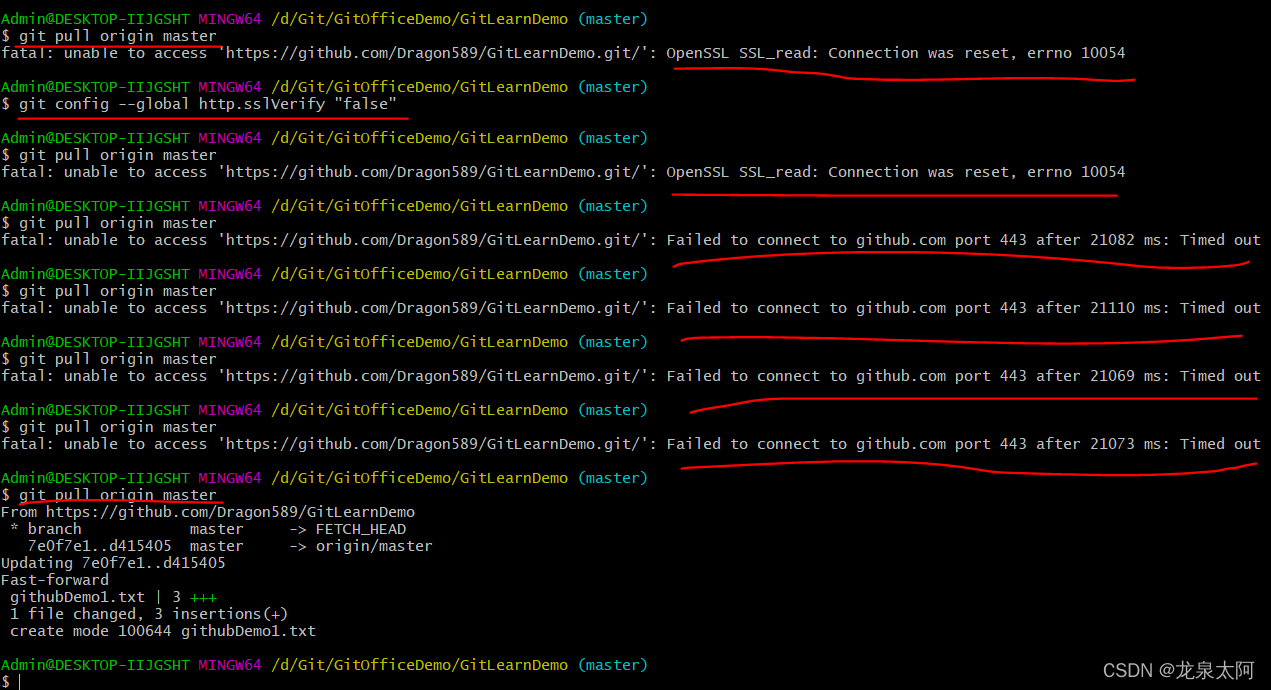 推送失败,又出现ssl验证问题。(经常出现这个问题,每次都要执行前面的解除ssl命令,比较麻烦,暂时没找到永久性解决办法,后续探索,这里先用前面的命令方式暂时解决。)