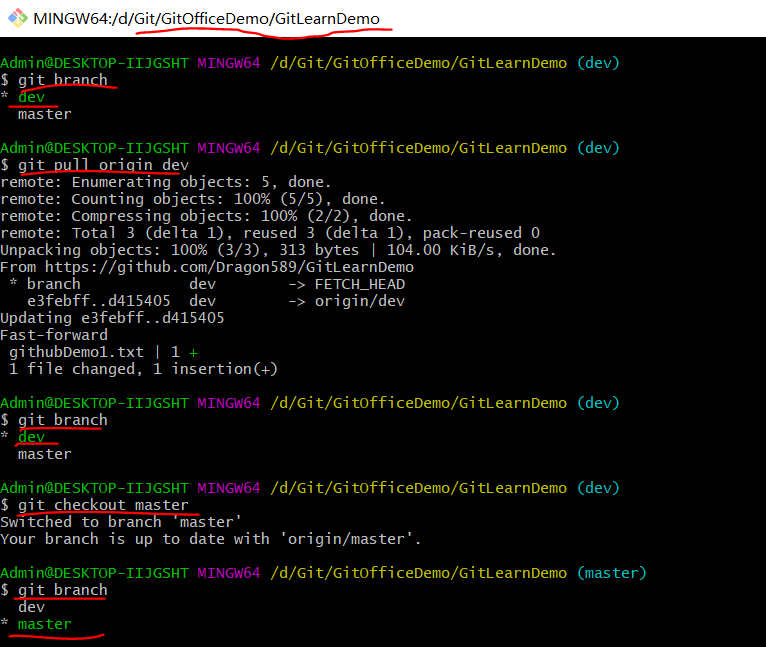 然后再去到公司的电脑,把远程的master和dev分支的最新代码都拉到公司的本地仓库: