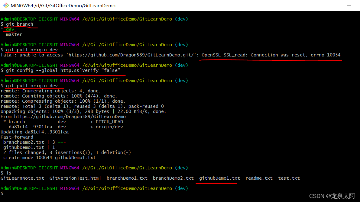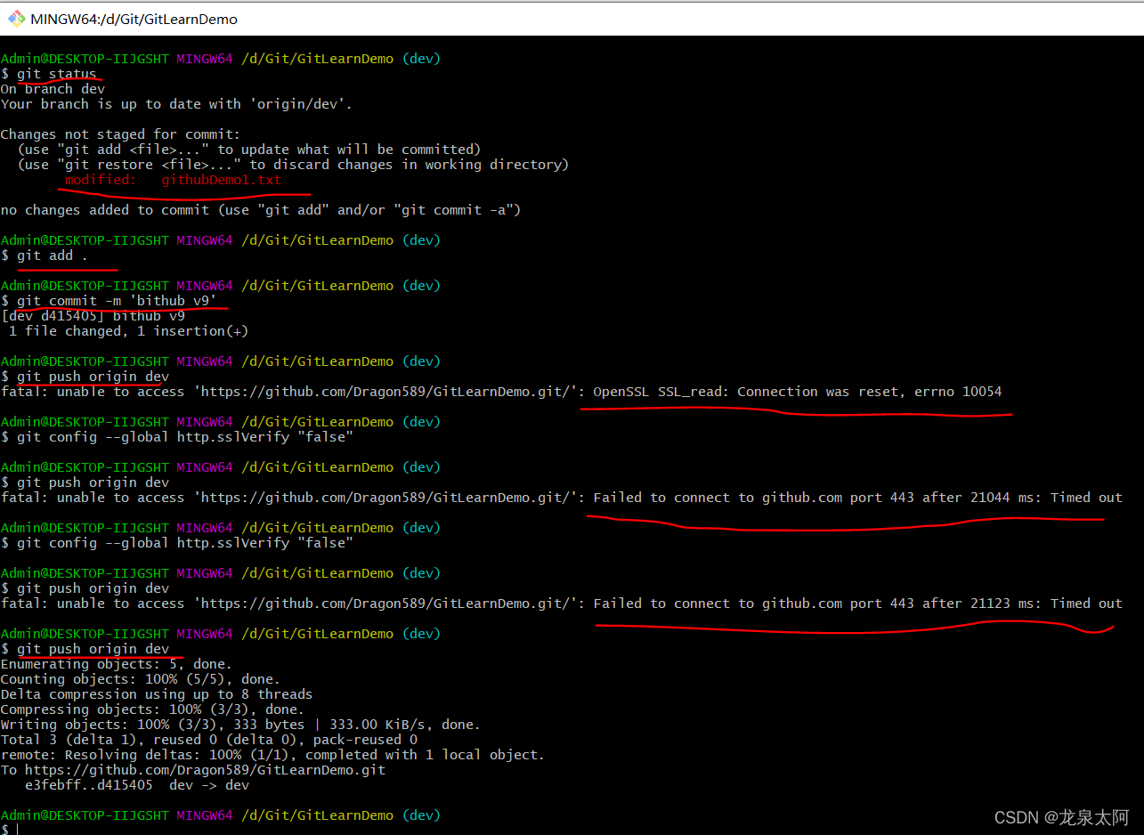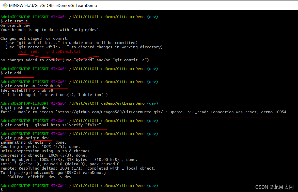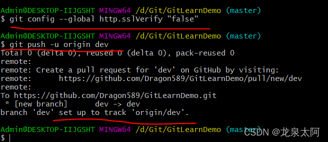 接下来执行命令解除ssl验证,并再次尝试推送dev分支到远程仓库: