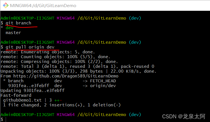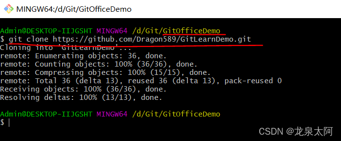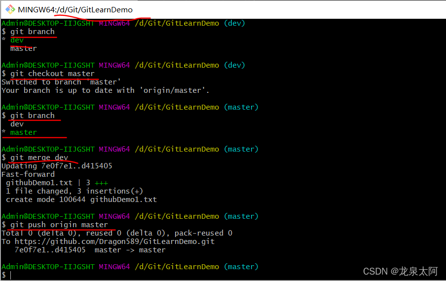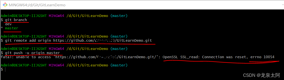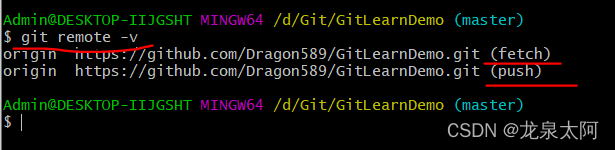 说明:origin其实是URL(https://github.com/***/GitLearnDemo.git)的别名,即时指远程仓库。