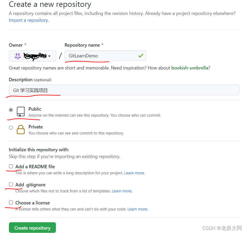 Choose a license: 如果勾选,则可以说明一个证书,比如写上该项目可以被使用但不能商业的声明信息。