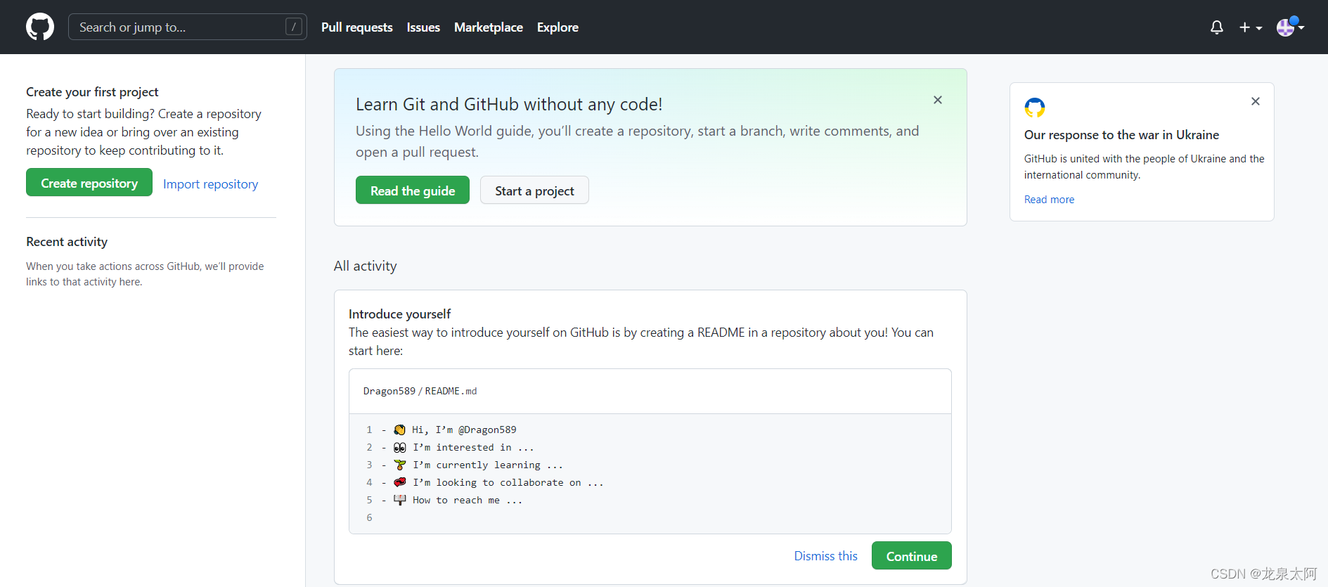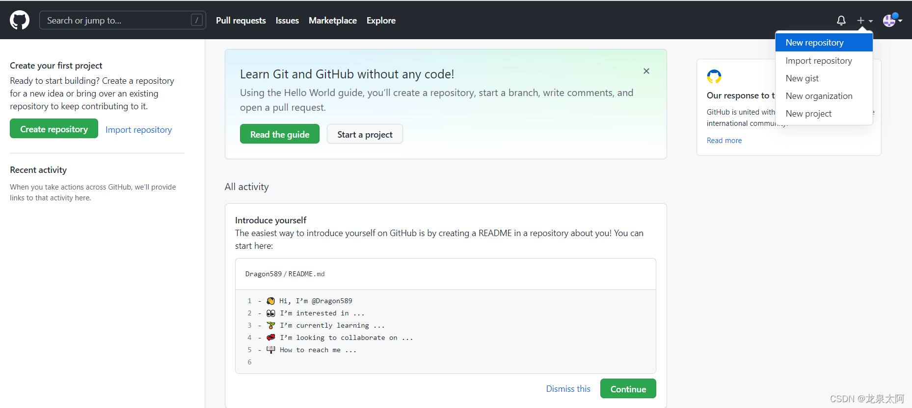 选择右上角的“+”号,点击“New repository” 选项创建仓库: