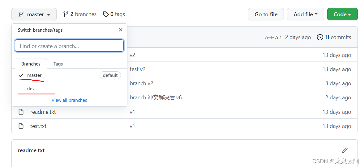 刷新远程仓库页面,发现dev分支已经被推送成功: