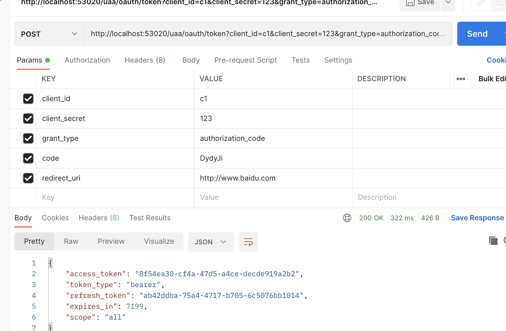 - /uaa/oauth/token? client_id=c1&client_secret=secret&grant_type=authorization_code&code=5PgfcD&redirect_uri=http://www.baidu.com