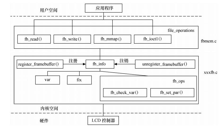 LCD驱动也是一个字符设备驱动,那么内核中是如何实现的呢?框架如下图: