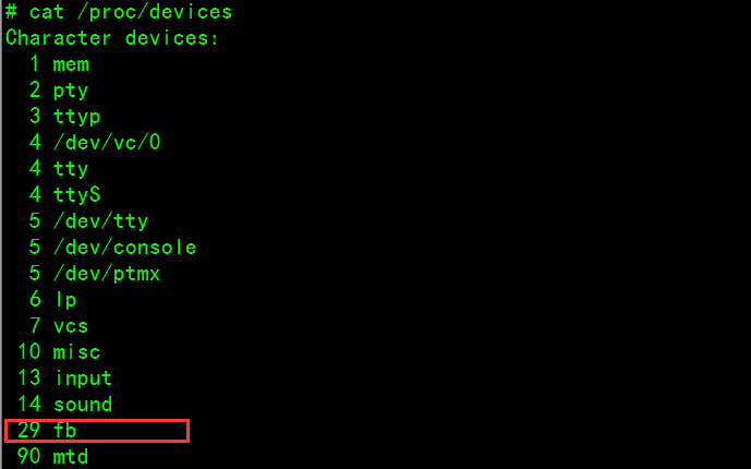 在fbmem_init()中创建字符设备"fb", 注册file_oprations结构体fb_fops,主设备FB_MAJOR为29。启动内核后在开发板上执行“cat /proc/devices”如下: