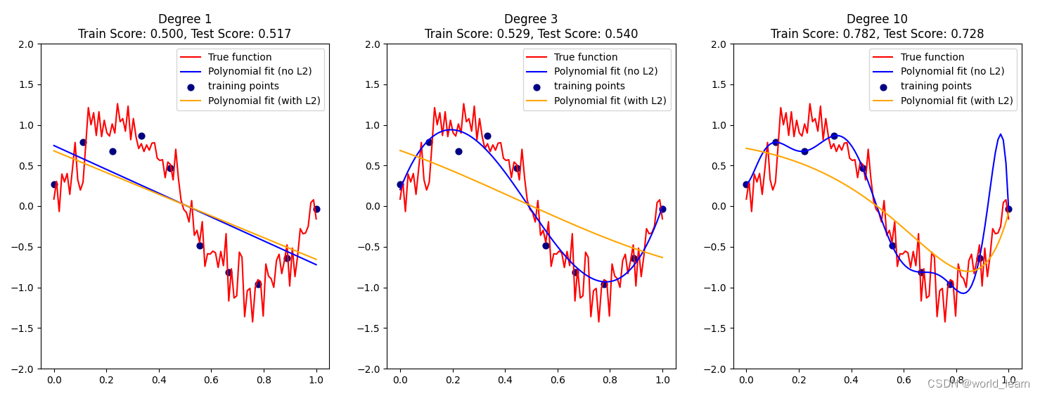 plt.figure(figsize=(18, 6))for i in range(len(degrees)):plt.subplot(1, len(degrees), i+1)degree = degrees[i]# 标准多项式拟合model = make_pipeline(PolynomialFeatures(degree), Ridge(alpha=0))model.fit(X, y)y_poly_pred = model.predict(X_test)plt.plot(X_test,y_test, color='red', label='True function')plt.plot(X_test, y_poly_pred, color='blue', label='Polynomial fit (no L2)')plt.scatter(X, y, color='navy', s=40, marker='o', label="training points")# 将多项式拟合添加L2正则化model = make_pipeline(PolynomialFeatures(degree), Ridge(alpha=0.1))model.fit(X, y)y_poly_pred = model.predict(X_test)plt.plot(X_test, y_poly_pred, color='orange', label='Polynomial fit (with L2)')plt.ylim(-2, 2)plt.legend(loc='best')plt.title("Degree {}\nTrain Score: {:.3f}, Test Score: {:.3f}".format(degree, model.score(X, y), model.score(X_test, y_test)))plt.show()