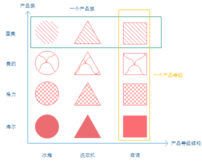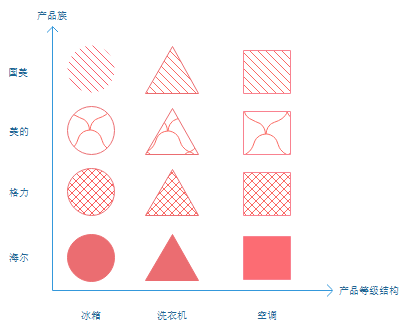 如图第一行实心红色表示的就是一个产品族,其中该海尔的产品族分别由海尔冰箱、海尔洗衣机和海尔空调组成。