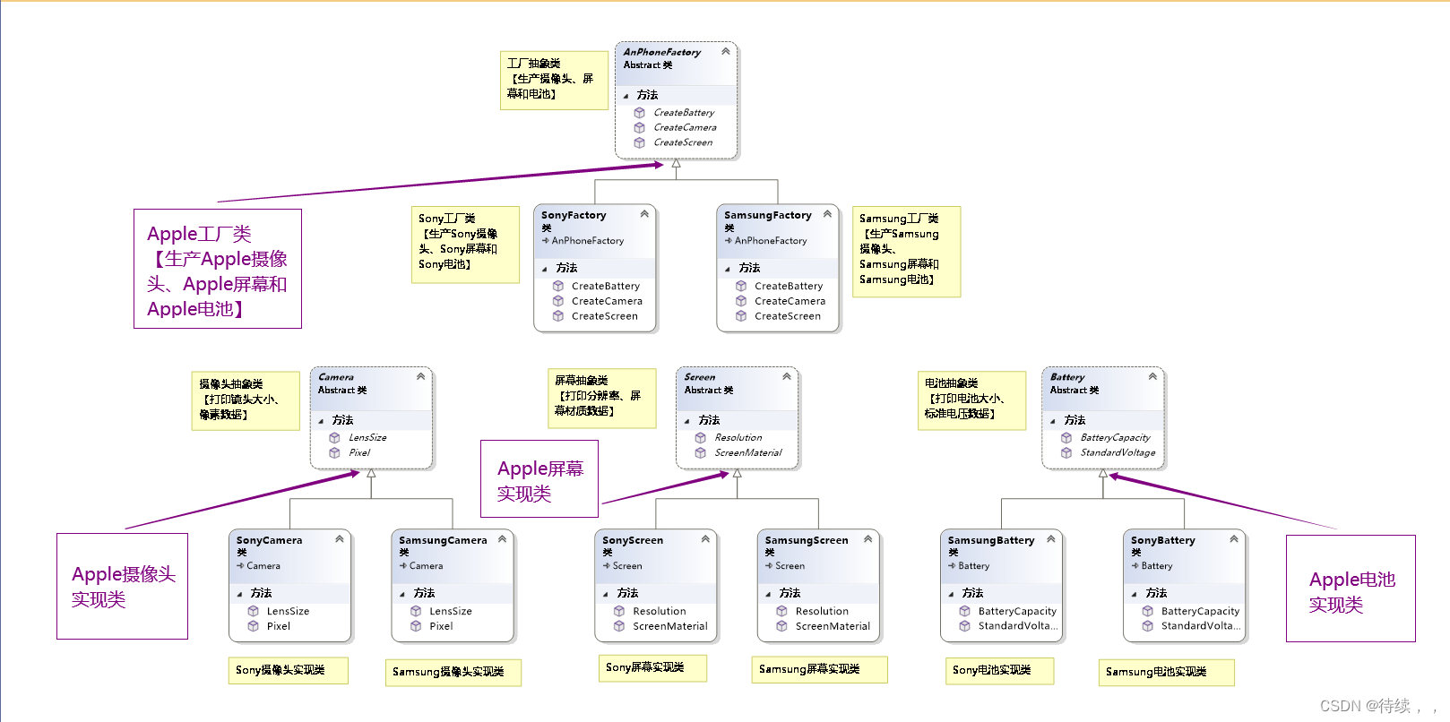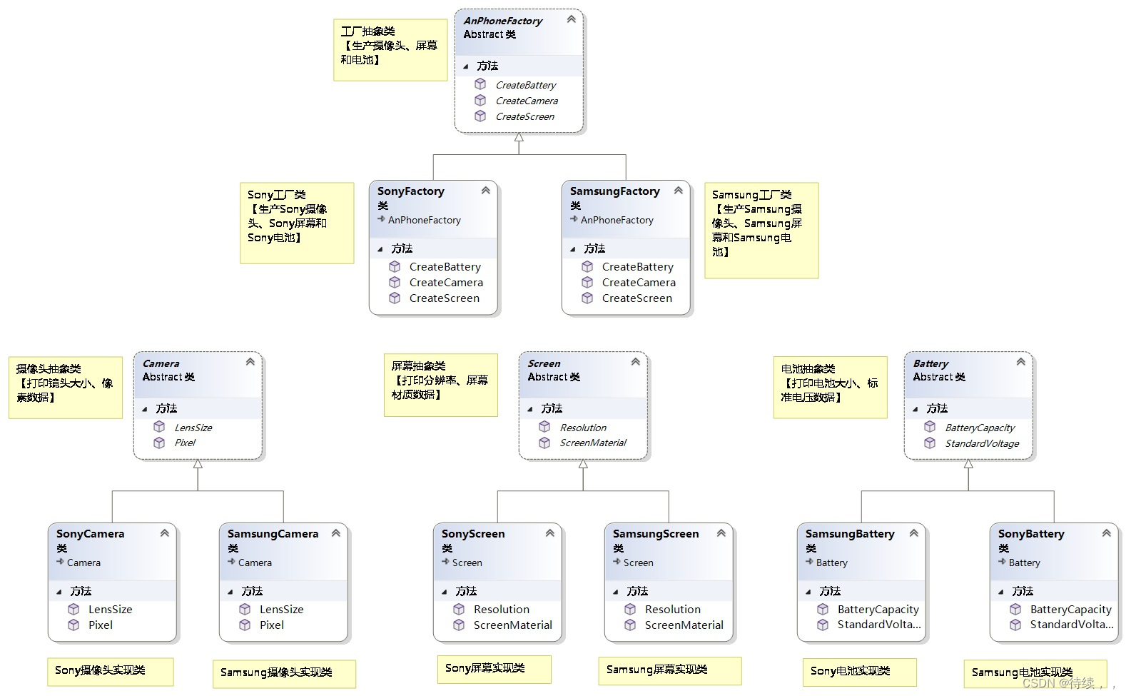 创建AnPhoneFactory抽象类,编写所需的创建设备的抽象方法,以获取所需的设备(这里不必关心设备来自于什么具体工厂)。创建Camera、Screen和Battery抽象类规定An工厂所需的设备数据。在Sony、Samsung工厂类中继承AnPhoneFactory,即皆要可以返回An手机工厂需要的所有设备。接下来,由具体工厂各自实现设备生产,继承An手机工厂规定的Camera、Screen和Battery抽象类,返回An手机工厂所需的所有设备数据。