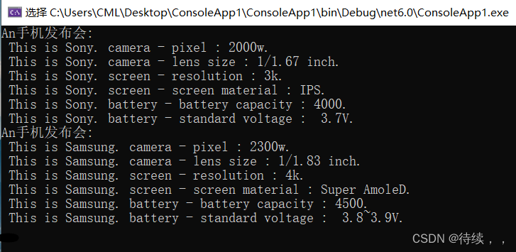 namespace ConsoleApp1 {public class Prpgram{static void Main(String[] args){Console.WriteLine("An手机发布会:");AnPhoneFactory anPhoneFactory_sony = new SonyFactory(); //设置设备为sony工厂提供Camera camera = anPhoneFactory_sony.CreateCamera(); //通过Sony设备规格生产摄像头camera.Pixel(); //打印Sony牌摄像头设备的像素信息camera.LensSize(); //打印Sony牌摄像头设备的镜头大小信息Screen screen = anPhoneFactory_sony.CreateScreen(); //通过Sony设备规格生产屏幕screen.Resolution();screen.ScreenMaterial();Battery battery = anPhoneFactory_sony.CreateBattery();battery.BatteryCapacity();battery.StandardVoltage();Console.WriteLine("An手机发布会:");AnPhoneFactory anPhoneFactory_sam = new SamsungFactory(); //设置设备为Samsung工厂提供Camera camera1 = anPhoneFactory_sam.CreateCamera(); camera1.Pixel(); camera1.LensSize();Screen screen1 = anPhoneFactory_sam.CreateScreen();screen1.Resolution();screen1.ScreenMaterial();Battery battery1 = anPhoneFactory_sam.CreateBattery();battery1.BatteryCapacity();battery1.StandardVoltage();Console.Read();}}////// AnPhoneFactory就是工厂的抽象角色,他并不知道产品该怎么被生产,所以只是规定了能够生产哪些产品,比如摄像头设备、屏幕设备和电池设备。/// public abstract class AnPhoneFactory{////// 创建摄像头设备/// public abstract Camera CreateCamera();////// 创建屏幕设备/// public abstract Screen CreateScreen();////// 创建电池设备/// public abstract Battery CreateBattery();}////// 三个抽象设备类 有了工厂我们需要产品,毕竟工厂要负责生产产品,我们有三个产品分别是摄像头设备、屏幕设备和电池设备,/// 但是他们只是一个抽象的产品,只是定义了自己所能拥有的标准。/// #region Herple public abstract class Camera{public abstract void Pixel(); //像素public abstract void LensSize(); //镜头大小}public abstract class Screen{public abstract void Resolution(); //分辨率public abstract void ScreenMaterial(); //屏幕材质}public abstract class Battery{public abstract void BatteryCapacity(); //电池大小public abstract void StandardVoltage(); //标准电压}#endregion/*产品只是定义了抽象的行为,是需要具体的产品进行完善的,*比如Sony摄像头、Sony屏幕和Sony电池以及Samsung摄像头、Samsung屏幕和Samsung电池,*从产品来说摄像头都属于抽象摄像头的具体产品,屏幕都属于抽象屏幕产品的具体产品...*所以摄像头都应该实现Camera,屏幕都应该实现Screen,电池都应该实现Battery。*/////// Sony 对应An手机工厂设备返回对应需求/// #region Sonypublic class SonyCamera : Camera{public override void LensSize(){Console.WriteLine(" This is Sony. camera - lens size : 1/1.67 inch.");}public override void Pixel(){Console.WriteLine(" This is Sony. camera - pixel : 2000w.");}}public class SonyScreen : Screen{public override void Resolution(){Console.WriteLine(" This is Sony. screen - resolution : 3k.");}public override void ScreenMaterial(){Console.WriteLine(" This is Sony. screen - screen material : IPS.");}}public class SonyBattery : Battery{public override void BatteryCapacity(){Console.WriteLine(" This is Sony. battery - battery capacity : 4000.");}public override void StandardVoltage(){Console.WriteLine(" This is Sony. battery - standard voltage : 3.7V.");}}#endregion////// Samsung 对应An手机工厂设备返回对应需求/// #region Samsungpublic class SamsungCamera : Camera{public override void LensSize(){Console.WriteLine(" This is Samsung. camera - lens size : 1/1.83 inch.");}public override void Pixel(){Console.WriteLine(" This is Samsung. camera - pixel : 2300w.");}}public class SamsungScreen : Screen{public override void Resolution(){Console.WriteLine(" This is Samsung. screen - resolution : 4k.");}public override void ScreenMaterial(){Console.WriteLine(" This is Samsung. screen - screen material : Super AmoleD.");}}public class SamsungBattery : Battery{public override void BatteryCapacity(){Console.WriteLine(" This is Samsung. battery - battery capacity : 4500.");}public override void StandardVoltage(){Console.WriteLine(" This is Samsung. battery - standard voltage : 3.8~3.9V.");}}#endregion/** 现在有了具体的产品,但是产品是需要被工厂所生产,而同一个品牌应该被同一个工厂所生产,* Sony的摄像头、屏幕和电池都应该被Sony工厂生产,而Samsung的摄像头、屏幕和电池都应该被Samsung工厂生产。* 只是他们可能不在一个流水线,实际上在同一品牌应该都是同一个工厂。*/#region 具体Factory////// Sony工厂 继承AnPhoneFactory,实现其三个设备创建方法/// public class SonyFactory : AnPhoneFactory{public override Camera CreateCamera(){return new SonyCamera(); //返回Sony自己产生的摄像头}public override Screen CreateScreen(){return new SonyScreen(); //返回Sony自己产生的屏幕}public override Battery CreateBattery(){return new SonyBattery(); //返回Sony自己产生的电池}}////// Samsung工厂 继承AnPhoneFactory,实现其三个设备创建方法/// public class SamsungFactory : AnPhoneFactory{public override Camera CreateCamera(){return new SamsungCamera(); //返回Samsung自己产生的摄像头}public override Screen CreateScreen(){return new SamsungScreen(); //返回Samsung自己产生的屏幕}public override Battery CreateBattery(){return new SamsungBattery(); //返回Samsung自己产生的电池}}#endregion } - 结果
