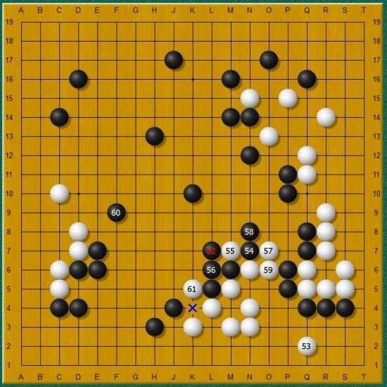 武宫正树九段(执白)第53步大飞,明显企图攻角,而ZEN(执黑)却直接不理,放弃整个右下角,转而把中腹走厚。这个交换究竟是否划算,就不在这里讨论了,但我们至少可以看出,ZEN敢于在此脱先,舍弃这么大的眼前利益,其搜索深度确实达到了人类专业棋手的水平。