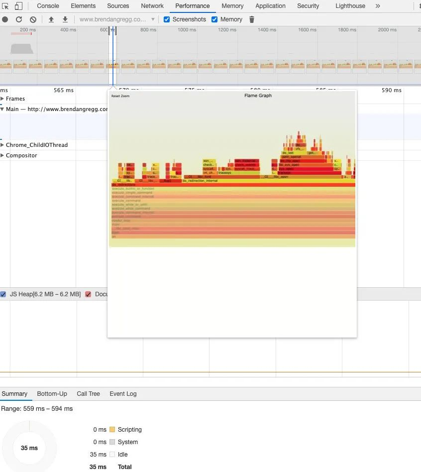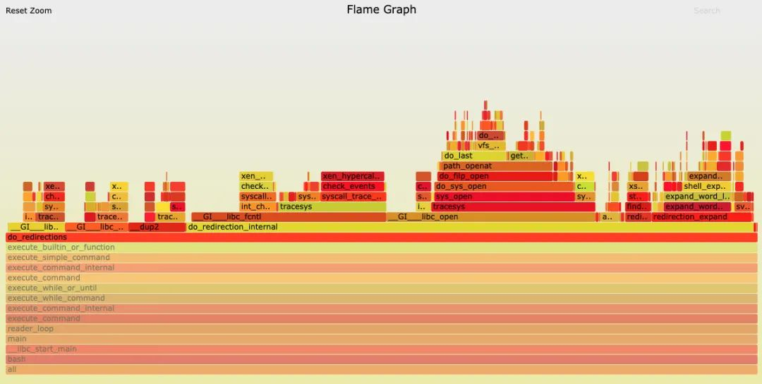 我们知道火焰图横轴表示的是时间长短,越宽表示运行的时间越长。纵轴表示的是调用栈,可以看出代码的执行顺序。