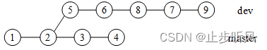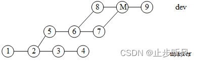 上图中,会将dev分支的5,6,7变基到master分支上,而7此时因为dev分支的变基而变得不可达,因此会被删除,而dev2分支的5,6则会因为dev2分支的存在而保留。