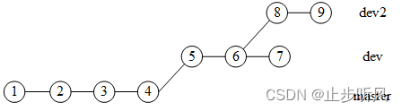 * + [master^] commit file3+ [dev2] commit file9+ [dev2^] commit file8+ [dev2~2] commit file6+ [dev2~3] commit file5