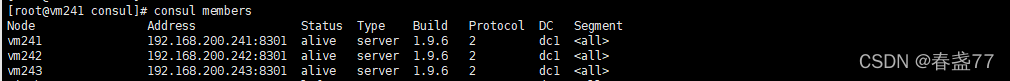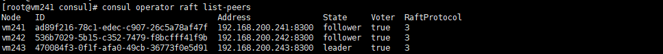 consul agent -server -bootstrap-expect=3 -data-dir=/tmp/consul -node=vm241 -bind=192.168.200.241 -client=0.0.0.0 -datacenter=dc1 -ui &