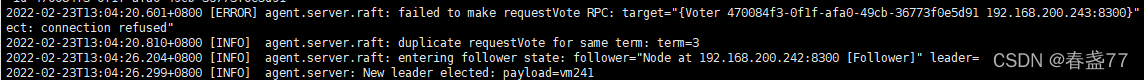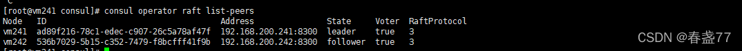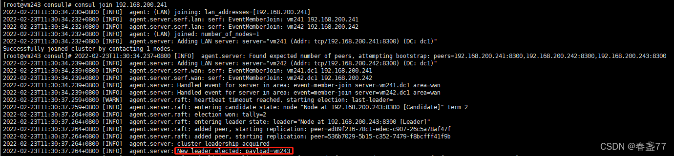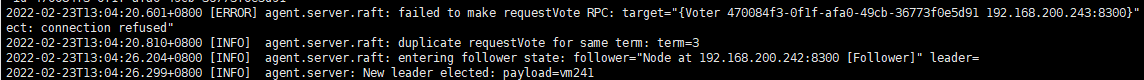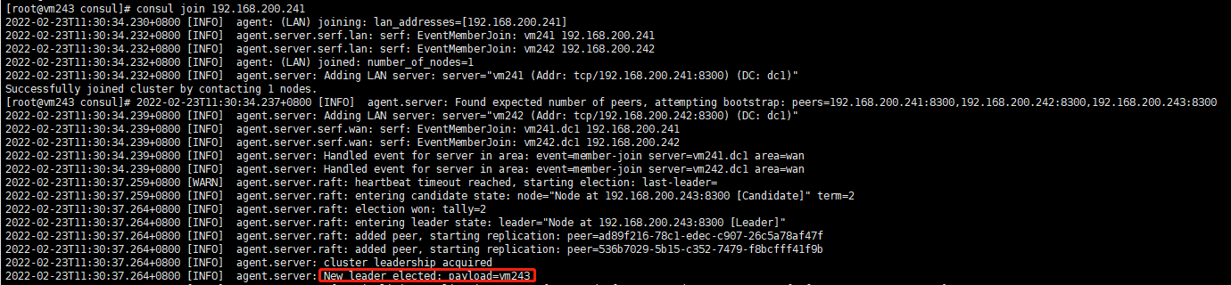 此时另外两台consul节点服务器会打印:agent.server: New leader elected: payload=vm241