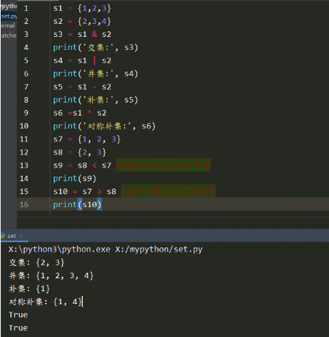 等同于字典,in运算符用于集合中,当某个值存在于集合中,则为真,否则为假,not in与in返回值相反。