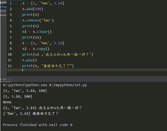 2、s.remove(e) 从集合中删除一个元素,如果元素不存于集合中,则会产生一个KeyError