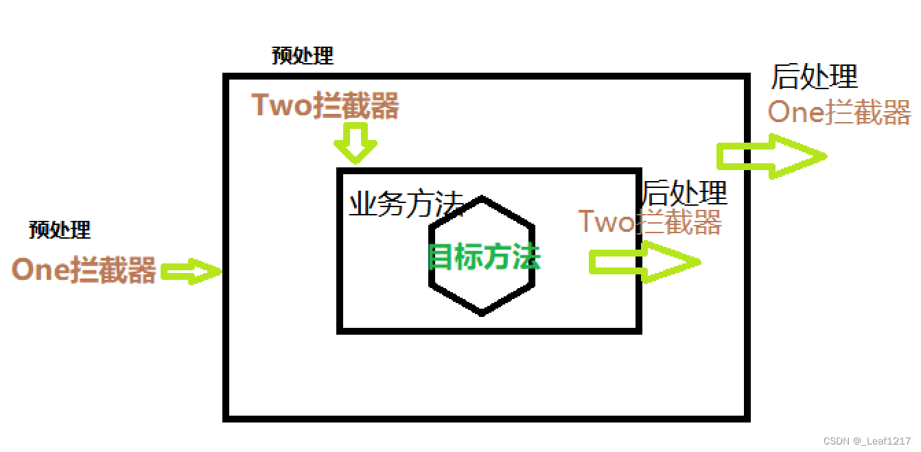 不一样的还有它们的执行顺序,前面关于拦截链的一些介绍已经说明了,需要理解它的执行顺序,这里Leaf特意花了一张运行图,配合文字,希望对大家有帮助。