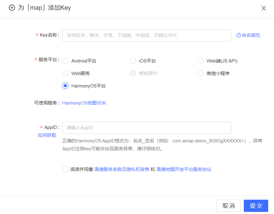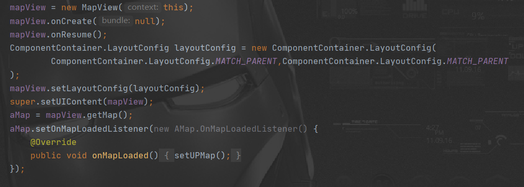 public class MainAbilitySlice extends AbilitySlice {private MapView mapView;private AMap aMap;@Overridepublic void onStart(Intent intent) {super.onStart(intent);super.setUIContent(ResourceTable.Layout_ability_main);initMap();}private void initMap(){mapView = new MapView(this);mapView.onCreate(null);mapView.onResume();ComponentContainer.LayoutConfig layoutConfig = new ComponentContainer.LayoutConfig(ComponentContainer.LayoutConfig.MATCH_PARENT,ComponentContainer.LayoutConfig.MATCH_PARENT);mapView.setLayoutConfig(layoutConfig);super.setUIContent(mapView);aMap = mapView.getMap();aMap.setOnMapLoadedListener(new AMap.OnMapLoadedListener() {@Overridepublic void onMapLoaded() {}});}@Overridepublic void onActive() {super.onActive();}@Overridepublic void onForeground(Intent intent) {super.onForeground(intent);}@Overrideprotected void onStop() {if(mapView != null){mapView.onDestroy();}}