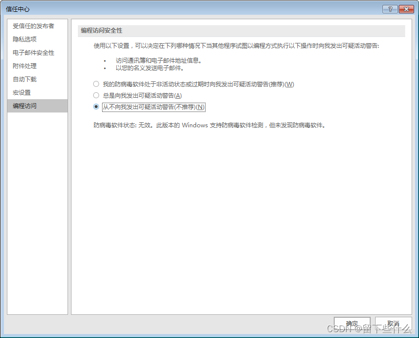 打开 Outlook->文件->选项->信任中心,打开“信任中心”对话框,左边选择“编程访问”,选择“我的防病毒......” 或者 “从不向发发出可疑活动警告”,然后点击“确定”按钮关闭对话框。