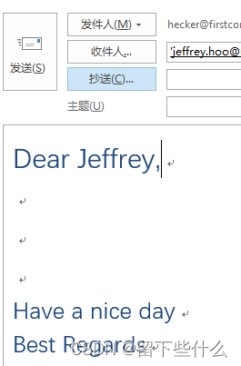首先要把收件人存储到Outlook联系人中,姓氏、名字、邮件地址不要录错。答复邮件时候柚子助手就后自动插入问候语到邮件最前面,问候语可以自定义,具体看后面的设置说明。