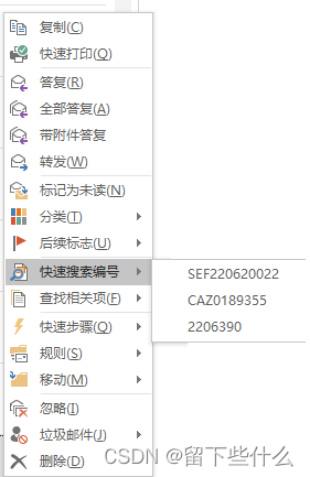 在邮件的右键菜单增加一个“快速搜索编号”菜单项,它会从邮件主题中提取数字或者数字和字母组合编号。比如工作号,订单号,提单号等。如下图所示,点击编号就自动全局搜索对应的编号。