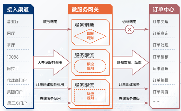 - 服务限流:当入口请求 QPS 超过服务配置的阀值时,如瞬时出现高并发订单查询请求时,订单查询服务可以配置对某些渠道的查询请求进行限制,以保证本服务不被压垮。