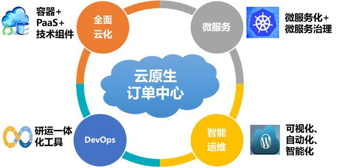 为了解决以上难题,浩鲸科技订单中心产品围绕全面云化、微服务、DevOps、智能运维,通过技术发展驱动IT支撑系统为业务提供创新价值,从四个方面全面实现云原生架构: