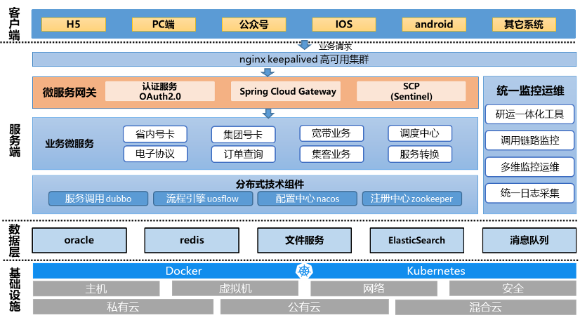 订单中心自底向上可分为基础设施层、数据层、应用服务端、应用客户端,还有统一监控运维中心: