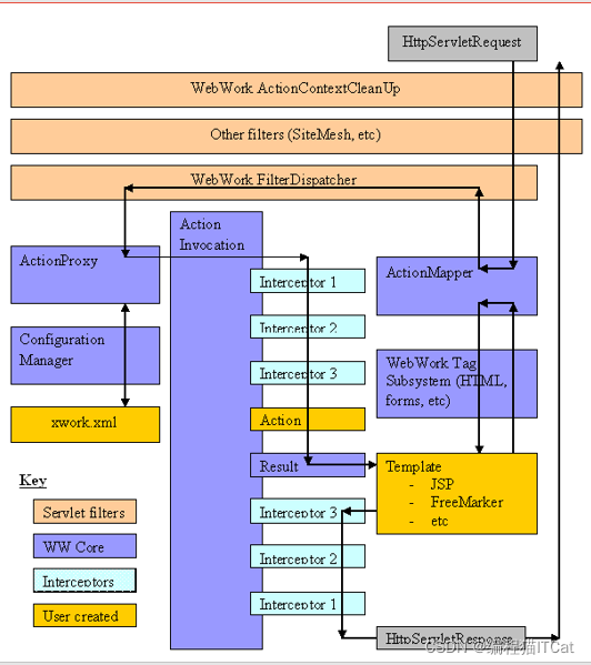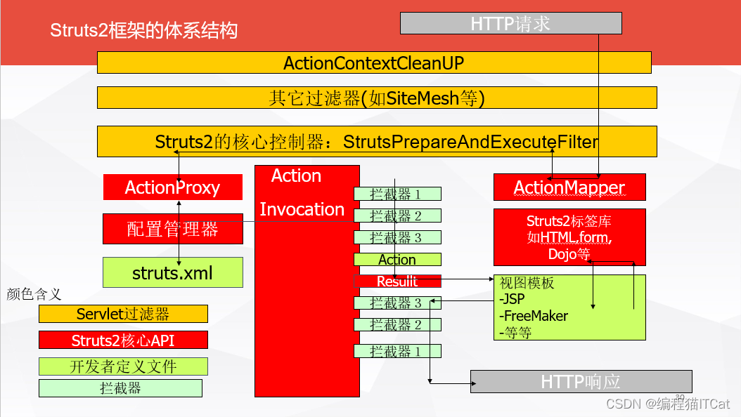 Http请求来的时候先初始化action上下文,通过不同的过滤器后进入到核心控制器。再通过Action映射找到要调用的Action,再把请求交给Action对象代理,代理通过xml文件指代要调用的action类,找到后会创建一个actionInvocation实例,实例再进入到Action的过程中会调用配置文件中不同的拦截器,将结构返回给模板引擎,模板引擎返回渲染的结果,通过拦截器最后生成响应返回给浏览器。