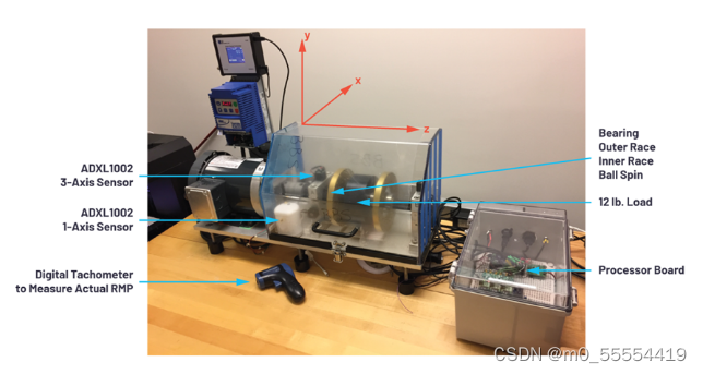 为了产生用于在LTspice中进行傅里叶分析的数据,将三个ADXL1002加速度计连接到电机,如图1所示,以测量侧向、垂向和纵向(分别为X、Y和Z)振动。