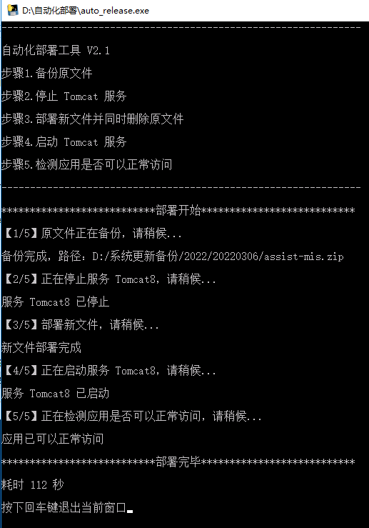 class AutoRelease():'''判断是否有管理员权限'''@staticmethoddef is_admin():try:return ctypes.windll.shell32.IsUserAnAdmin()except:return False'''根据端口号获取pid'''@staticmethoddef get_pid(port):task_info = os.popen('netstat -ano | findstr {}'.format(port))line = task_info.readline()task_info.close()if line == "":return "" field_list = line.split()pid = field_list[4]return pid'''根据端口号停止进程'''@staticmethoddef close_process(port):pid = AutoRelease.get_pid(port)if pid == "" or pid == "0":print("端口 %s 已停止或不存在" % port)returnif AutoRelease.is_admin():os.popen('taskkill /pid %s /f' % pid)else:print("正在停止进程(端口) %s ..." % port)if sys.version_info[0] == 3:# 以管理员权限重新打开一个进程执行命令,最后一个参数表示是否显示cmd窗口,0 隐藏,1 显示ctypes.windll.shell32.ShellExecuteW(None, "runas", sys.executable, __file__, None, 0)'''启动指定的服务'''@staticmethoddef start_service(service_name):if AutoRelease.is_admin():os.popen('net start {}'.format(service_name))else:#print("正在启动服务 %s,请稍候..." % service_name)if sys.version_info[0] == 3:# 以管理员权限重新打开一个进程执行命令,最后一个参数表示是否显示cmd窗口,0 隐藏,1 显示ctypes.windll.shell32.ShellExecuteW(None, "runas", sys.executable, __file__, None, 0)'''停止指定的服务'''@staticmethoddef stop_service(service_name):if AutoRelease.is_admin():os.popen('net stop {}'.format(service_name))else:#print("正在停止服务 %s,请稍候..." % service_name)if sys.version_info[0] == 3:# 以管理员权限重新打开一个进程执行命令,最后一个参数表示是否显示cmd窗口,0 隐藏,1 显示ctypes.windll.shell32.ShellExecuteW(None, "runas", sys.executable, __file__, None, 0)'''压缩目录'''@staticmethoddef archive_file(out_zip, root_dir):try:shutil.make_archive(out_zip, 'zip', root_dir=root_dir)except Exception:return Falseelse:return True'''复制文件'''@staticmethoddef copy_file(src_file, dest_path):if not os.path.isfile(src_file):print("文件 %s 不存在\n" % src_file)return Falseelse:if not os.path.exists(dest_path):os.makedirs(dest_path)shutil.copy(src_file, dest_path)return True'''判断http资源是否可以访问@url http资源地址'''@staticmethoddef get_http_status(url): try:request = requests.get(url)except Exception:return Falseelse:httpStatusCode = request.status_codeif httpStatusCode == 200:return Truereturn Falsedef run():print("-" * 63)print("\n{0}{1}\n".format("自动化部署工具 V2.1", "\t" * 11))print("步骤1.备份原文件\n")print("步骤2.停止 Tomcat 服务\n")print("步骤3.部署新文件并同时删除原文件\n")print("步骤4.启动 Tomcat 服务\n")print("步骤5.检测应用是否可以正常访问\n")print("-" * 63)print("\n{0}{1}{0}\n".format("*" * 27, "部署开始"))# 应用端口号port = "8383"# 服务名称service_name = "Tomcat8"# war包名称war_file_name = "assist-mis.war"# 备份压缩包名称zip_file_name = "assist-mis.zip"# 项目所在目录work_dir = "D:/apache-tomcat-8.5.38/webapps"# 备份根目录backup_dir = "D:/系统更新备份/2022"# 缓存目录cache_dir = "D:/apache-tomcat-8.5.38/work/Catalina/localhost"# urlurl = "http://127.0.0.1:8383/assist-mis"try:start_time = int(time.time())if not os.path.exists(war_file_name):print("当前目录未找到文件 %s ,部署终止\n" % war_file_name)input("按下回车键退出当前窗口")sys.exit(0)print("【1/5】原文件正在备份,请稍候...\n")date_str = time.strftime('%Y%m%d', time.localtime(time.time()))project_dir = work_dir+"/"+war_file_name[:war_file_name.find(".")]out_zip_dir = "{}/{}".format(backup_dir, date_str)if not os.path.exists(out_zip_dir):os.makedirs(out_zip_dir)if AutoRelease.archive_file(out_zip_dir+"/"+zip_file_name, project_dir) :print("备份完成,路径:"+out_zip_dir+"/"+zip_file_name+"\n")print("【2/5】正在停止服务 %s,请稍候..." % service_name+"\n")AutoRelease.stop_service(service_name)# AutoRelease.close_process(port)during_time_stop = 0;while True:pid = AutoRelease.get_pid(port)if pid == "" or pid == "0":print("服务 %s 已停止" % service_name+"\n")breaktime.sleep(1)during_time_stop += 1if during_time_stop == 60:print("服务 %s 停止超时,请手动停止" % service_name+"\n")print("【3/5】部署新文件,请稍候...\n")AutoRelease.copy_file(war_file_name, out_zip_dir)if os.path.isfile(work_dir+"/"+war_file_name):os.remove(work_dir+"/"+war_file_name)if os.path.exists(project_dir):shutil.rmtree(project_dir, True)if os.path.exists(cache_dir):shutil.rmtree(cache_dir, True)AutoRelease.copy_file(war_file_name, work_dir)print("新文件部署完成\n")print("【4/5】正在启动服务 %s,请稍候...\n" % service_name)AutoRelease.start_service(service_name)during_time_start = 0while True:if AutoRelease.get_pid(port) != "":print("服务 %s 已启动\n" % service_name)breaktime.sleep(1)during_time_start += 1if during_time_start == 60:print("服务 %s 启动超时,请手动启动\n" % service_name)print("【5/5】正在检测应用是否可以正常访问,请稍候...\n")during_time_access = 0while True:if AutoRelease.get_http_status(url):print("应用已可以正常访问\n")breaktime.sleep(5)during_time_access += 5if during_time_access == 60:print("应用访问超时\n")except Exception as e:print("部署异常:{}\n".format(str(e)))else:print("{0}{1}{0}\n".format("*" * 27, "部署完毕"))print("耗时 {} 秒\n".format(int(time.time()) - start_time))webbrowser.open(url)input("按下回车键退出当前窗口")#os.system("pause")if __name__ == "__main__":run()