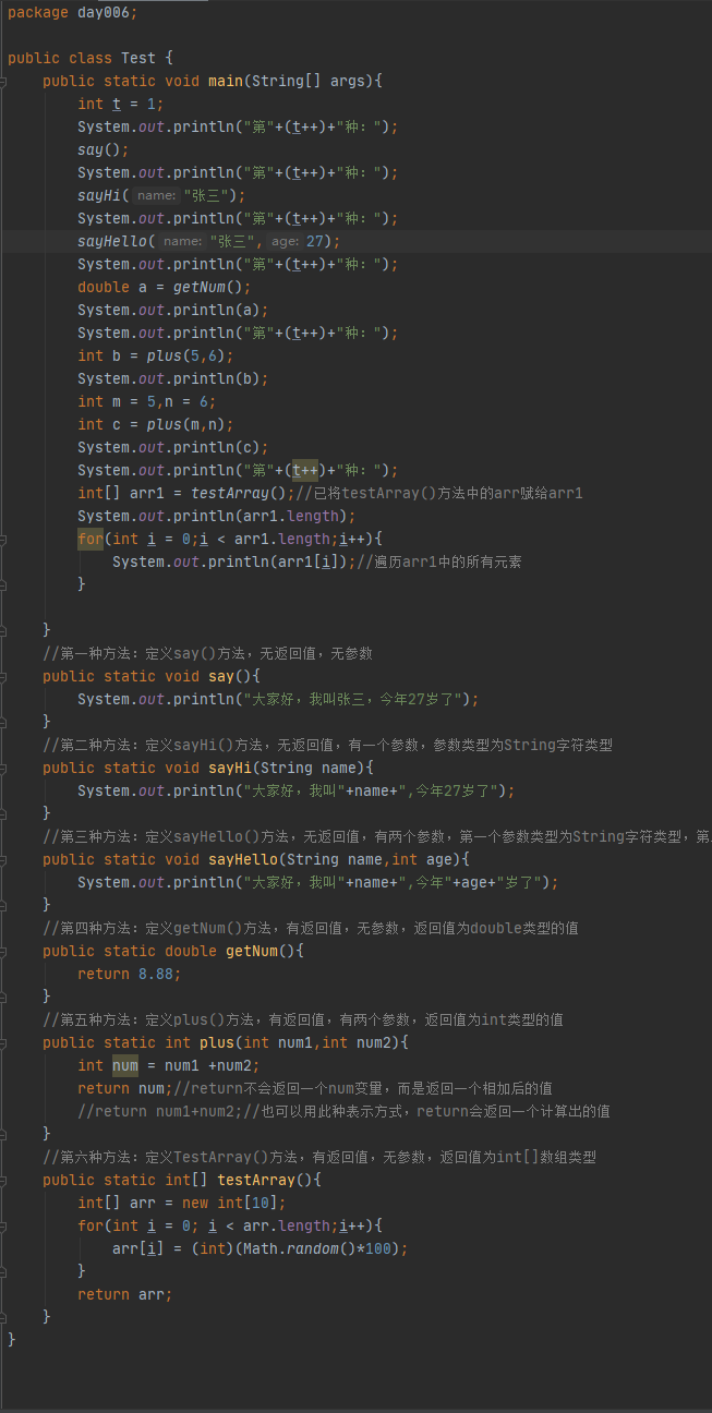 参数类型:8中基本类型+数组类型,参数名:采用“小驼峰”命名