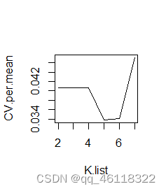 findk <- function(X,y,K.list,S=5){ #S表示交叉验证中的折数(S-折交叉验证)nk = length(K.list)#进行数据分组n = dim(X)[1] #数据的行数CV.ID = sample(rep(1:S,length.out = n)) #进行1到S的循环,总长度为n(如1,2,3,4,1,2,3,4,1,2...),并进行打乱CV.per = matrix(NA,nk,S)#交叉验证的下标for (i in 1:nk) {for (j in 1:S){X.test = X[CV.ID==j,] #相当于从被分为S份的数据中随机抽取1份作为测试数据集,循环S次y.test = y[CV.ID==j]X.train = X[CV.ID!=j,] #相当于从被分为S份的数据中随机抽取(S-1)份作为训练数据集,循环S次y.train = y[CV.ID!=j]y.hat =myknn(X.train, y.train, X.test,K = K.list[i], distance = 'euclidean') #测试数据集中y的预测值y.test = as.numeric(y.test)y.hat = as.numeric(y.hat) #将向量转化为数值型CV.per[i,j] = mean((y.test-y.hat)^2)}}CV.per.mean = apply(CV.per, 1, mean) #将各K值对应的交叉验证误差存储在此向量中plot(K.list,CV.per.mean,type="l") #绘制k值与对应误差值的函数图,可用于直观判断k值的最佳取值K.opt = K.list[which.min(CV.per.mean)]list(CV.per=CV.per, CV.per.mean=CV.per.mean, K.opt=K.opt)}