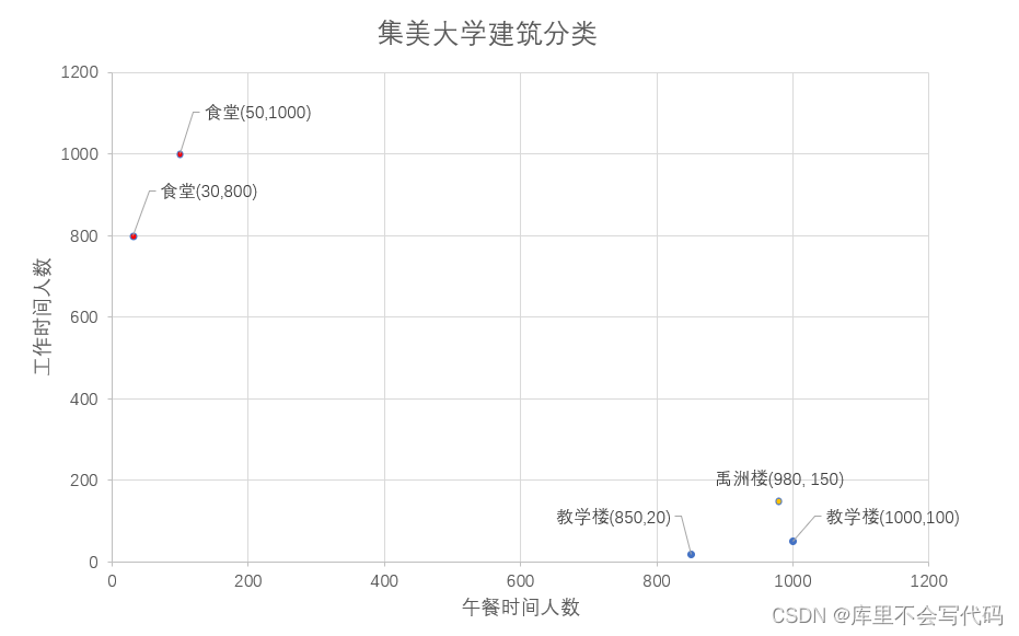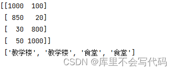 def createDataSet():#四组二维特征features = np.array([[1000,100],[850,20],[30,800],[50,1000]])#四组特征的标签labels = ['教学楼','教学楼','食堂','食堂']return features, labels