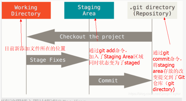 由此引入 Git 项目的三个工作区域的概念:Git 仓库(the Git directory,) 工作目录( the working tree)以及暂存区域(the staging area.)。