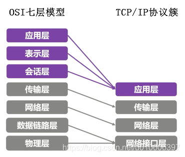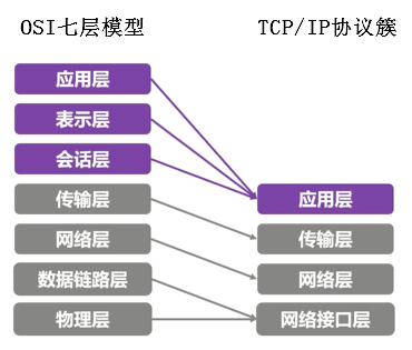 TCP/IP协议簇把OSI七层网络模型的应用层、表示层、会话层合并为一层——应用层。应用层直接和应用程序接口结合,并提供常见的网络应用服务。