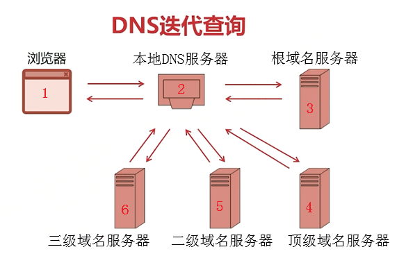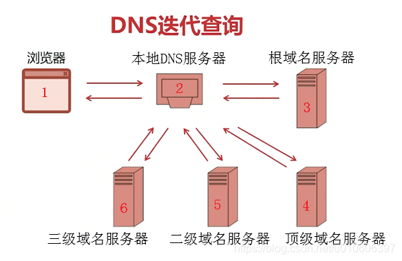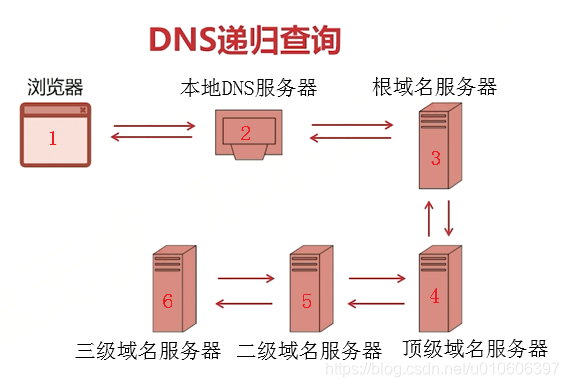 5、后面二级域名服务器、三级域名服务器的过程也类似,缓存中有结果则返回,没有就去低一级的域名服务器查询。最终返回结果,这是一个递归调用的过程。