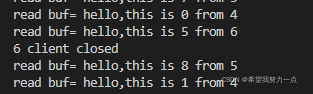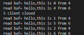 {int fd=socket(AF_INET,SOCK_STREAM,0);if(fd==-1){perror("socket:");exit(-1);}sockaddr_in serveraddr;inet_pton(AF_INET,"127.0.0.1",&serveraddr.sin_addr.s_addr);serveraddr.sin_port=htons(9090);serveraddr.sin_family=AF_INET;int ret=connect(fd,(sockaddr*)&serveraddr,sizeof(serveraddr));if(ret==-1){perror("connect: ");exit(-1);}int n=0;while(1){if(n<9) n++;else n=0;char sendBuf[50]="hello,this is ";sendBuf[14]=(char)(n+'0');write(fd,sendBuf,strlen(sendBuf));char readBuf[80]="client received ";int len=read(fd,sendBuf,sizeof(sendBuf));if(len==0){cout<<"server closed\n";break;}else if(len==-1){perror("read: ");exit(-1);}strcat(readBuf,sendBuf);cout<