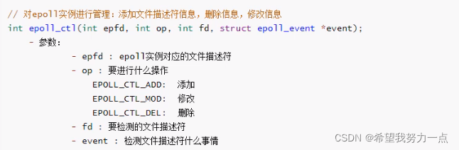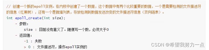 {int lfd=socket(PF_INET,SOCK_STREAM,0);struct sockaddr_in saddr;saddr.sin_port=htons(9090);saddr.sin_family=AF_INET;saddr.sin_addr.s_addr=INADDR_ANY;int ret=bind(lfd,(sockaddr*)&saddr,sizeof(saddr));if(ret==-1){perror("bind");exit(-1);}ret=listen(lfd,8);if(ret==-1){perror("listen");exit(-1);}//创建eventpoll实例 参数>0就可以int epfd=epoll_create(100);//将监听Lfd相关信息加入epfd实例epoll_event epev;epev.events=EPOLLIN;epev.data.fd=lfd;epoll_ctl(epfd,EPOLL_CTL_ADD,lfd,&epev);//被监听后,发生改变的fd集合epoll_event epevs[1024];while(1){//让内核检测epev实例 阻塞,直到有变化int ret=epoll_wait(epfd,epevs,1024,-1);if(ret==-1){perror("epoll_wait");exit(-1);}//检测到有ret个fd对应的缓冲区的数据发生了改变。printf("ret = %d\n",ret);for(int i=0;i