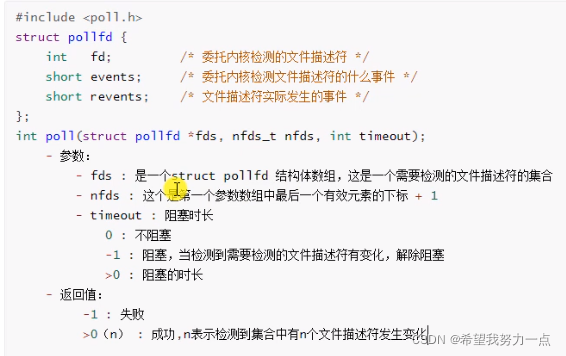 {int lfd=socket(PF_INET,SOCK_STREAM,0);struct sockaddr_in saddr;saddr.sin_port=htons(9090);saddr.sin_family=AF_INET;saddr.sin_addr.s_addr=INADDR_ANY;int ret=bind(lfd,(sockaddr*)&saddr,sizeof(saddr));if(ret==-1){perror("bind");exit(-1);}ret=listen(lfd,8);if(ret==-1){perror("listen");exit(-1);}pollfd fdset[2048]; //要监听的fd集合结构体for(int i=0;i<2048;i++){fdset[i].fd=-1;fdset[i].events=POLLIN;//检测读事件}fdset[0].fd=lfd; //将监听lfd加入集合。int maxfd=0;while(1){//让内核检测fd集合 阻塞,直到有变化int ret=poll(fdset,maxfd+1,-1);if(ret==-1){perror("poll");exit(-1);}//检测到有fd对应的缓冲区的数据发生了改变。//判断监听的lfd 是否有客户端要连接if(fdset[0].revents & POLLIN){sockaddr_in clientaddr;int len=sizeof(clientaddr);int cfd=accept(lfd,(sockaddr*)&clientaddr,(socklen_t*)&len);//将通信fd加入rdset。 遍历是为了重用在连接过程中已使用又断开的fd位置。for(int i=1;i<2048;i++){if(fdset[i].fd==-1){fdset[i].fd=cfd;fdset[i].events=POLLIN;maxfd = maxfd>i ? maxfd : i; //更新最大的fd索引break;}}}//遍历其他的cfd,判断是否有数据读 从监听的lfd+1开始遍历。for(int i=1;i