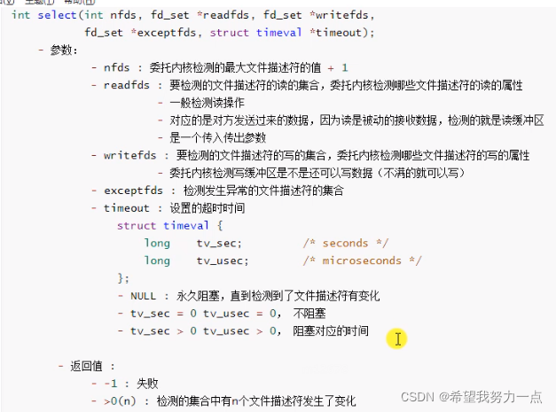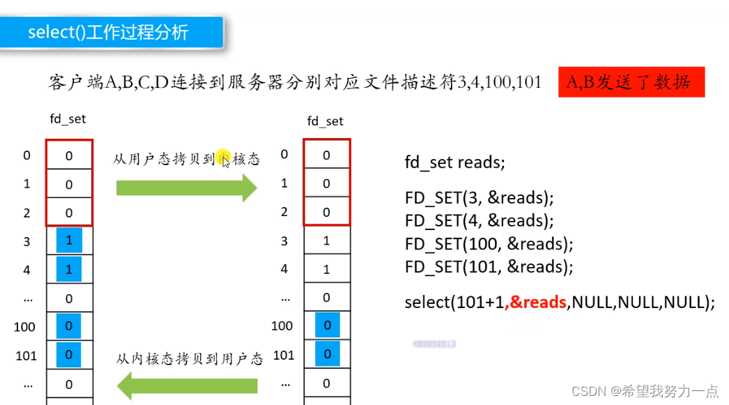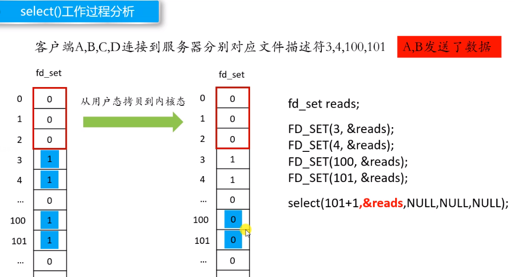 readfds等是指针,指明要检测的fd的集合,如0010.内核检测后会将其改变为检测到的结果。如第二个有数据可以读,第3个没有,则修改为0100;
