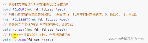 {int lfd=socket(PF_INET,SOCK_STREAM,0);struct sockaddr_in saddr;saddr.sin_port=htons(9090);saddr.sin_family=AF_INET;saddr.sin_addr.s_addr=INADDR_ANY;int ret=bind(lfd,(sockaddr*)&saddr,sizeof(saddr));if(ret==-1){perror("bind");exit(-1);}ret=listen(lfd,8);if(ret==-1){perror("listen");exit(-1);}fd_set rdset,tmp_set;//要检测的fd集合FD_ZERO(&rdset);//初始化FD_SET(lfd,&rdset);//添加要检测的fdint maxfd=lfd;while(1){tmp_set=rdset; //使内核修改fd不影响我们要检测的fd//让内核检测fd集合 永久阻塞,直到有变化int ret=select(maxfd+1,&tmp_set,nullptr,nullptr,nullptr);if(ret==-1){perror("select");exit(-1);}//检测到有fd对应的缓冲区的数据发生了改变。//判断监听的lfd 是否有客户端要连接if(FD_ISSET(lfd,&tmp_set)){sockaddr_in clientaddr;int len=sizeof(clientaddr);int cfd=accept(lfd,(sockaddr*)&clientaddr,(socklen_t*)&len);//将通信fd加入rdset。FD_SET(cfd,&rdset);maxfd = maxfd>cfd ? maxfd : cfd; }//遍历其他的cfd,判断是否有数据读 从监听的lfd+1开始遍历。for(int i=lfd+1;i