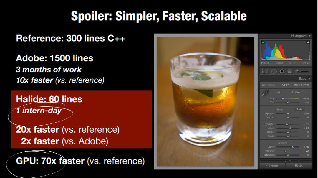 从下图可以看出同样的一个算法处理(局部拉普拉斯变换),使用直接的C++语言写出来算法速度很慢,Adobe公司使用3个月对这个算法进行了优化(手工优化)使这个算法的速度快了10倍,但是如果使用Halide,只需要几行代码,并且比普通直接的算法快上20倍,因此Halide在图像处理方面的代码优化的效果及效率是显然可见的。因此Halide的代码优化思路对于研究深度学习推理加速优化领域是值得借鉴的。