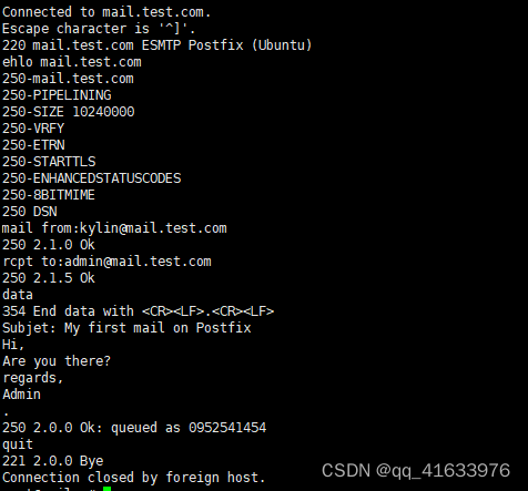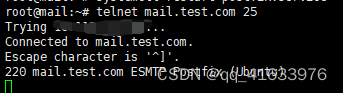 bash中输入 $telnet mail.test.com 25 ,即登陆本机的邮件服务端口,进入postfix提示符: