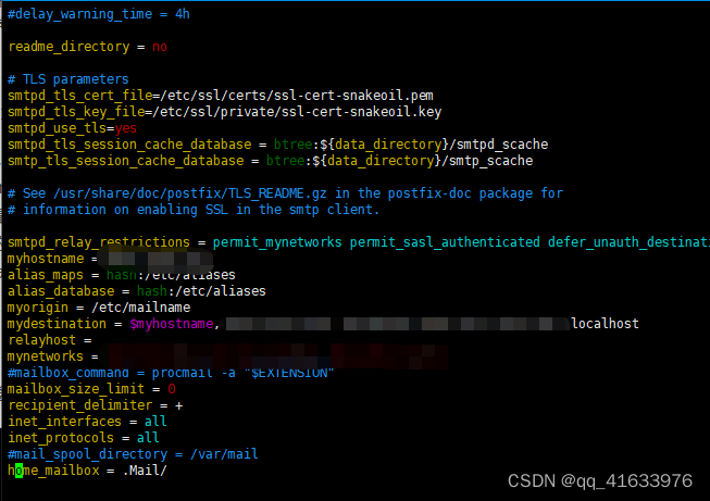 打开你的 Postfix 配置文件 /etc/postfix/main.cf,确保配置了maildir 而不是 mbox 的邮件存储方式,mbox 是给每个用户一个单一大文件,而 maildir 是每条消息都存储为一个文件。大量的小文件比一个庞大的文件更稳定且易于管理。文件最后一列添加一行 home_mailbox = Maildir/,告诉 Postfix 你需要 maildir 格式,并且在每个用户的家目录下创建一个 Maildir目录。你可以取任何名字,不一定要是 Maildir,另外还需要注释掉mailbox_command,你的配置完成后重启postfix服务 systemctl restart postfix。