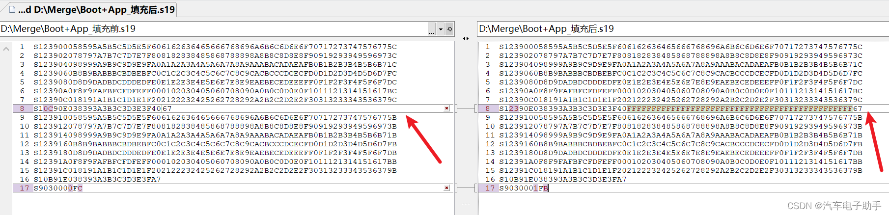 运行该批处理Merging_Two_S19_File.bat,对比修改前后两个Boot+App.s19文件的差异,见图2-3。