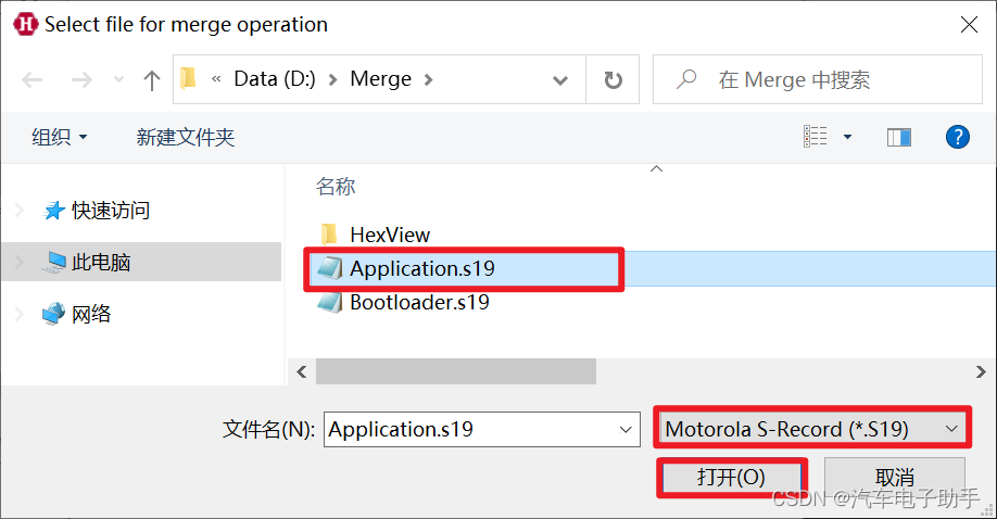 在弹出的Select file for merge operation对话框中,选择Application.s19文件,接着单击打开,见图2-6。